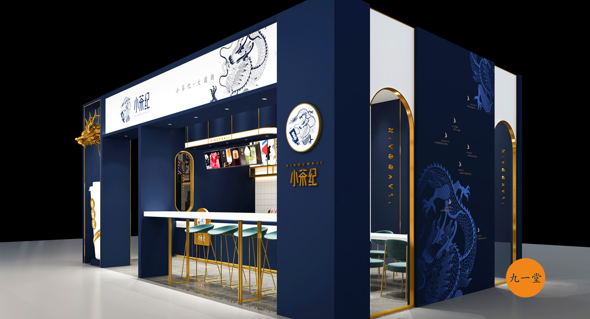 一葉神奇的東方樹葉,成為了風靡世界的中國潮。中國是茶的故鄉,成都是茶文化的起源地。小茶紀,創建于成都,用一杯小茶紀成為風靡世界的東方美茶潮流。在小茶紀的空間設計上采用深藍和金色色調,體現小茶紀品牌的沉穩的性格,但有沒有摒棄此品牌時尚的氣質,大面積鈦金的收邊提升了品牌整體品質。門頭的形象墻采用龍頭的設計契合項目的品牌定位,體現出大國的豪邁,白色杯子的運用使得整個空間時尚感十足。并且龍頭和杯子的運用在此空間中十分搶眼,是整個空間的點金之筆。
